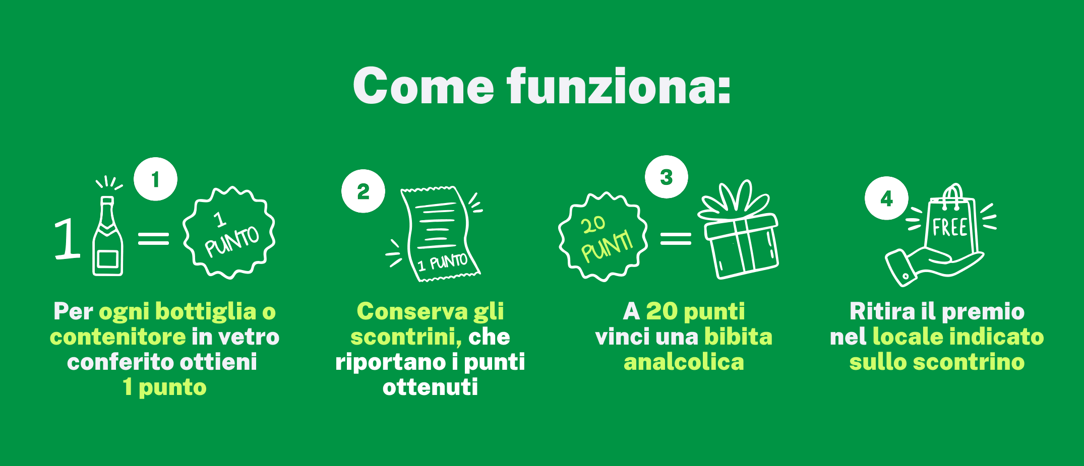 - Ogni volta che inserisci una bottiglia o un contenitore in vetro, ricevi 1 punto digitale. (Prima di conferire le bottiglie/contenitori in vetro verifica sempre che il pulsante della macchina abbia una luce verde fissa e che sul display della macchina ci sia scritto "PRONTA".)
